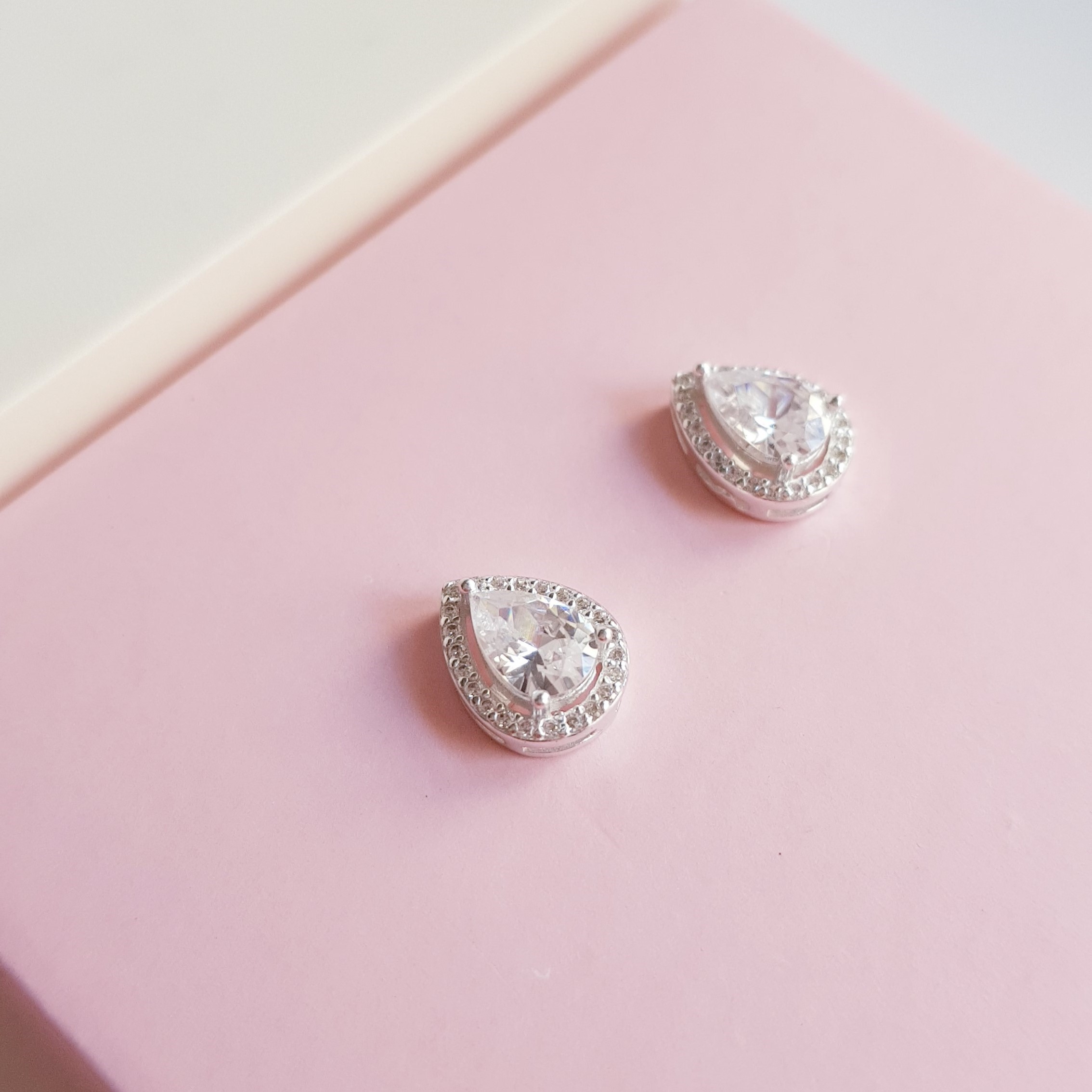 * Brinco Ponto de Luz Zirconia Gota com acabamento Borda Cravejada medindo 8mm x 10mm.